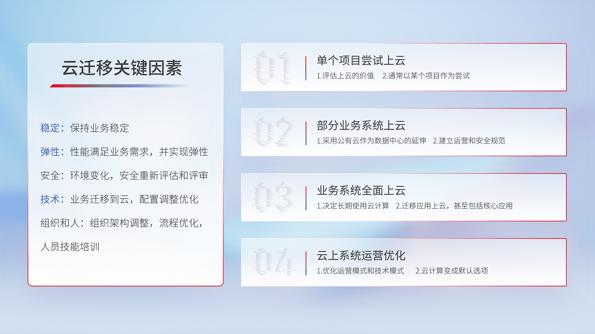 结合实际业务,,,,从规划设计、、、、云平台选型、、云原生改造、、、、数据迁移、、集成交付,,,迁移全过程为客户识别最佳上云路径,,做好风险识别管理,,,,设计网络架构、、、、身份权限、、、、安全审计合规、、、操作审计、、、日志审计、、监控告警策略、、、、多站点容灾设计等,,,,对云上基础设施进行整体规划,,,,提升IT治理水平,,,以满足弹性、、高可用、、、、高性能的需求。。。。